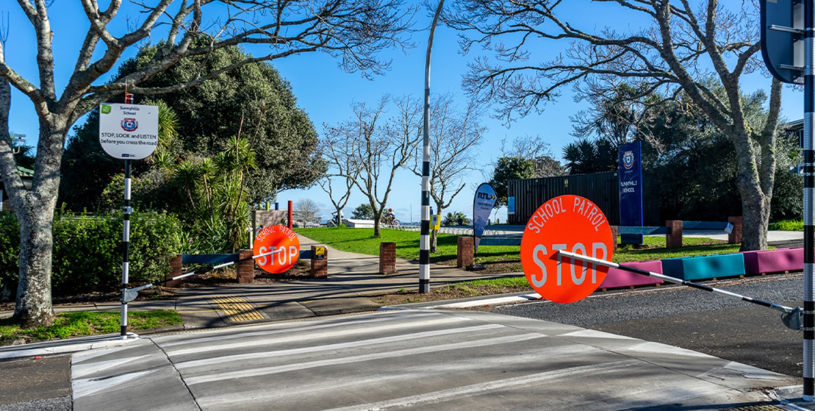 There are two Types of a School Patrols used around primary schools, intermediate and high schools in New Zealand. The standard School Crossing / Zebra Crossing which has the painted lines like a standard pedestrian crossing and Kea Crossings / School Crossing Point. Each type of crossing has a specific setup and differing requirements for road signs, school patrol arms (lollipop signs) the steel poles that they go on.