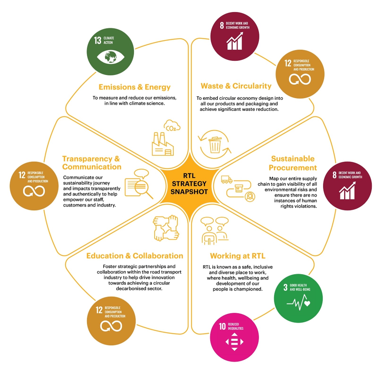 RTL's Sustainable Development Goals (SDGs) include SDG 3, 8, 10, 12 & 13: